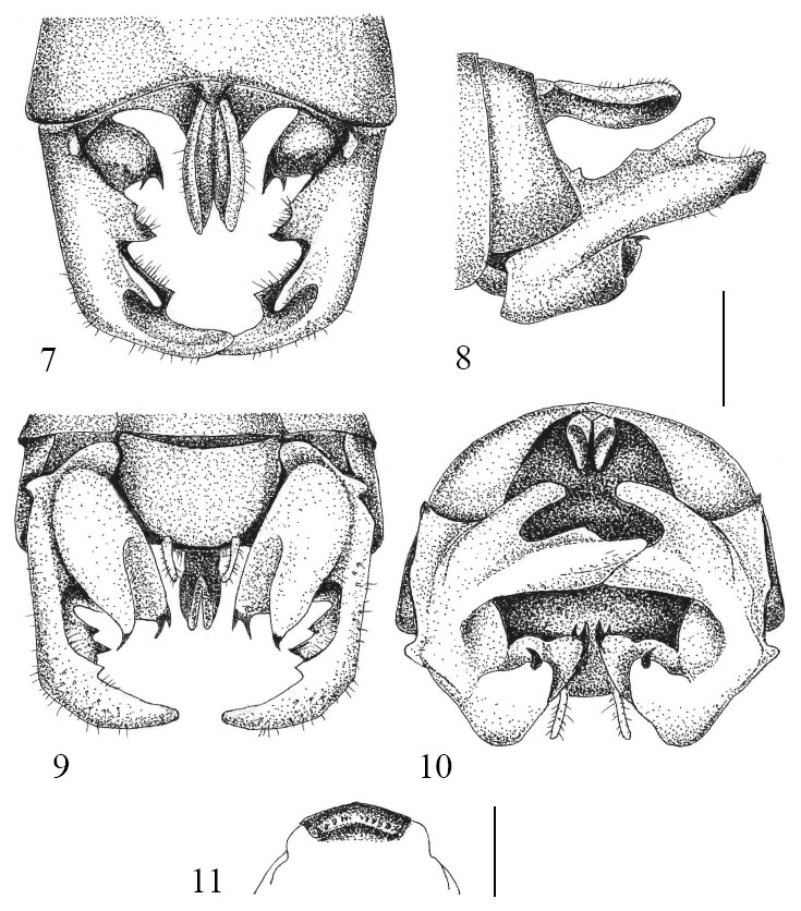 terminal segments of male: 7 dorsal, 8 lateral, 9 ventral, 10 posterior view (scale bar 1 mm), and 11 apex of phallic complex (scale bar 0.2 mm)